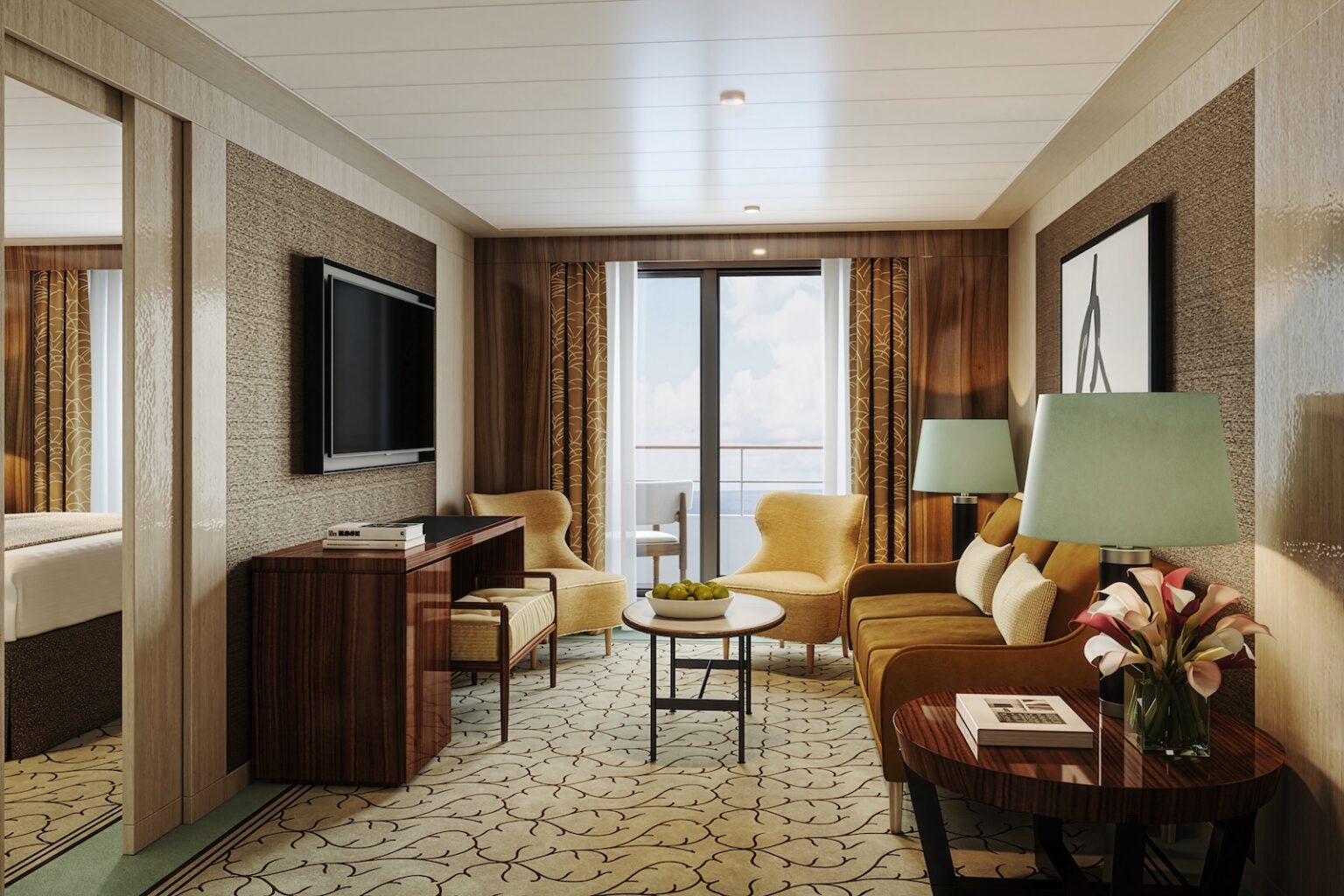 A rendering of a Concierge Veranda Suite (Atlas Ocean Voyages)