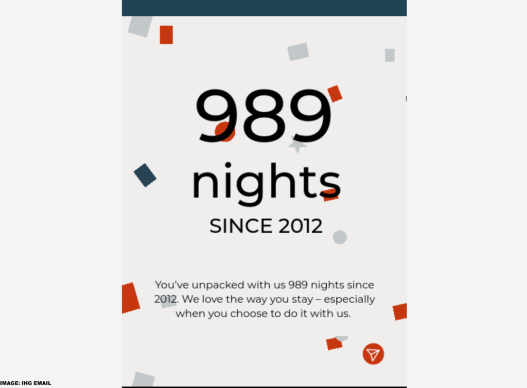 The email from IHG One Rewards included information I had not seen before: the number of nights you have consumed since your joining date, which, in my case, is 2012 (I had an account reset that year).