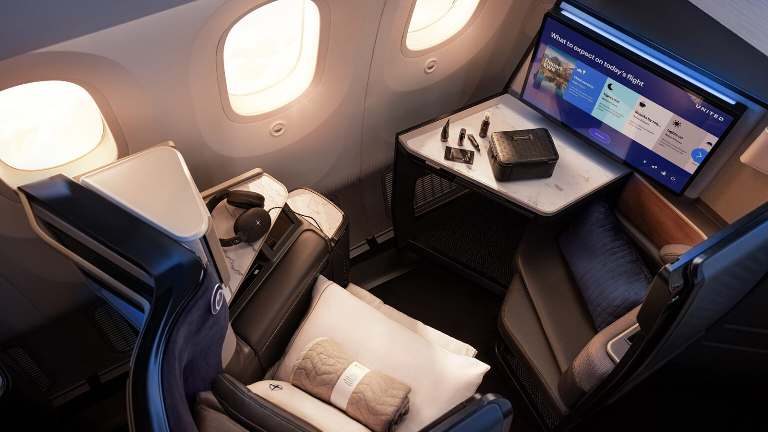 Starting March 19, 2026, travelers can book seats on United’s most premium international aircraft—the 787-9 Dreamliner with the United Elevated interior. Unveiled last May, this new aircraft has been redesigned from nose-to-tail with 99 total premium seats—the highest of percentage among U.S. carriers—and marks the introduction of the airline’s new United Polaris Studio suites: eight, lie-flat, all-aisle-access seats that are 25 percent larger than standard United Polaris seats with privacy doors*, an extra ottoman seat, exclusive entrée options, an Ossetra caviar amuse-bouche service, new amenity kits with elevated skincare offerings, wireless charging, Bluetooth connectivity, and a huge 27-inch, 4K OLED seatback screen—the largest among U.S. carriers.