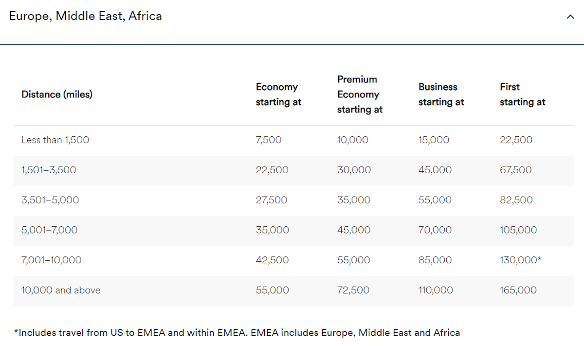 However, something very strange is going on at the moment, whereby many partner awards with connections have higher pricing than you’d expect (this was flagged on FlyerTalk). Let me explain with a couple of examples. Below is Atmos Rewards’ Europe, Middle East, and Africa award chart, which is relevant for this example.